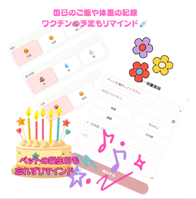 3秒で終わる健康記録: 「ごはん」「散歩」「トイレ」はボタンを押すだけ。食欲や元気もスタンプで手軽に残せます。